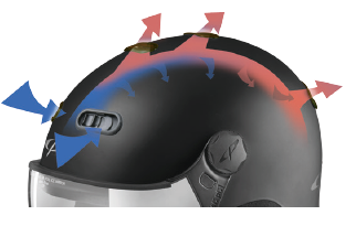 Wir haben verschiedene Systeme in unseren Helmen verbaut, je nach Preis und Design gibt es eine aktive und stufenlos einstellbarere Lüftung oder eine passive Lüftung die jederzeit für ein angenehmen Klima sorgt